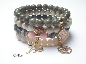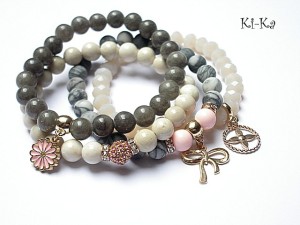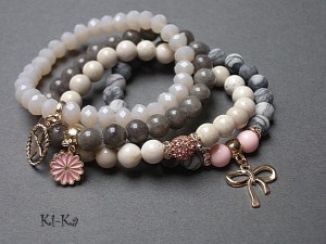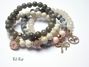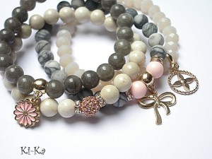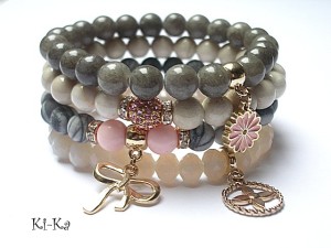 ******** PRAWA AUTORSKIE ********* Nowa odsłona naszych setów - "ACCENT-POINT SET" - neutralne ,stonowane tło i akcent kolorystyczny jako tylko mały punkt . W tym przypadku akcentem jest kolor jasnoróżowy. Komplet czterech bransoletek wykonanych z naturalnych kamieni: jaspis matowy [8mm], marmur [8mm], muszla [8mm], krysztalków [8 x 6mm], przekładki shamballa wysadzanej kryształkami Swarovskiego, oraz elementów metalowych w kolorze tzw.różowego złota. Bransoletki pasują na nadgarstek 15,5 - 16,5cm. Biżuteria ozdobnie zapakowana