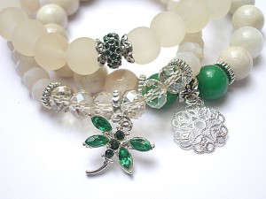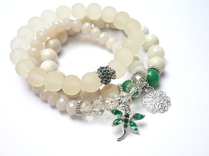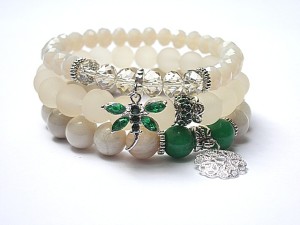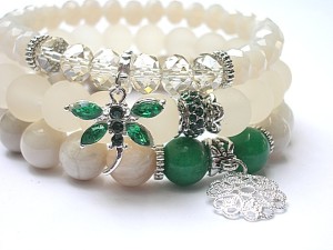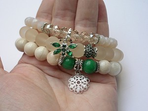 ******** PRAWA AUTORSKIE ********* Nowa odsłona naszych setów - "ACCENT-POINT SET" - neutralne ,stonowane tło i akcent kolorystyczny jako tylko mały punkt . W tym przypadku akcentem jest kolor szmaragdowy Komplet trzech bransoletek wykonanych z naturalnych kamieni: kamień księżycowy [10mm], jadeitów [10mm], kryształków fasetowanych [8 x 6mm], szkła matowego [10mm], przekładki wysadzanej cyrkoniami oraz elementów metalowych w kolorze srebra. Bransoletki pasują na nadgarstek 15,5 - 16,5cm. Biżuteria ozdobnie zapakowana