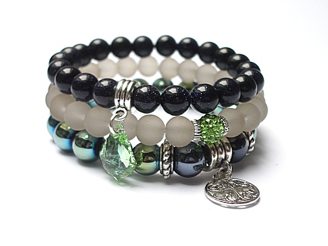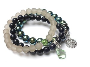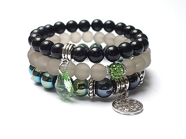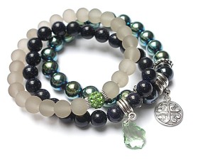 ******** PRAWA AUTORSKIE ********* Nowa odsłona naszych setów - "ACCENT-POINT SET" - neutralne ,stonowane tło i akcent kolorystyczny jako tylko mały punkt . W tym przypadku akcentem jest kolor perydot. Komplet trzech bransoletek wykonanych z naturalnych kamieni: noc kairu [8mm], szkła matowego [8mm], szkła opalizującego [10mm], hematytu [10mm], kuleczki shamballa wysadzanej kryształkami Swarovskiego, przewieszki kryształkiem Swarovskiego w kształcie kropli barokowej [Peridot] oraz elementów metalowych w kolorze srebra. Bransoletki pasują na nadgarstek 16 - 17cm. Biżuteria ozdobnie zapakowana
