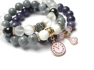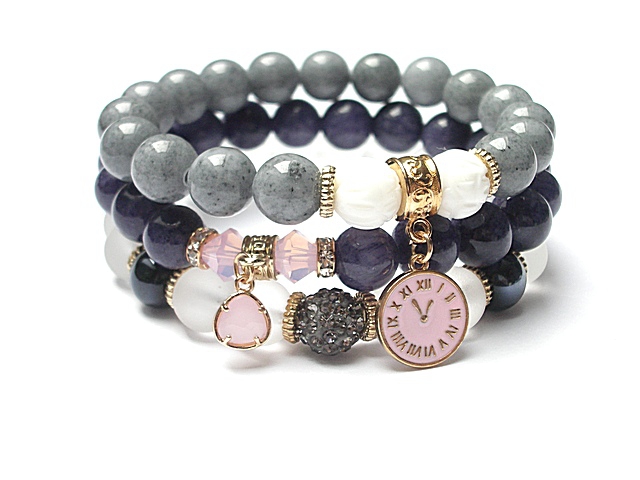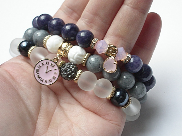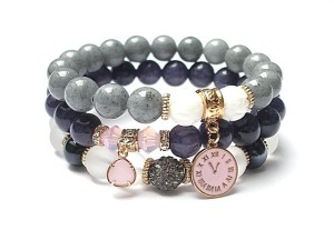 ******** PRAWA AUTORSKIE ********* Nowa odsłona naszych setów - "ACCENT-POINT SET" - neutralne ,stonowane tło i akcent kolorystyczny jako tylko mały punkt . W tym przypadku akcentem jest kolor rózowy. Komplet trzech bransoletek wykonanych z naturalnych kamieni: jadeitów [10mm] ,kuleczek białego rzeźbionego korala [10mm] ,matowych szklanych kuleczek [10mm] ,szklanych kuleczek glass [10mm] kryształków Swarovskiego [6mm] kuleczki shamballa wysadzanej kryształkami Swarovskiego [10mm] efektownej przywieszki w okuciu oraz elementów metalowych w kolorze tzw.różowego złota. Bransoletki pasują na nadgarstek 16-17cm.Biżuteria ozdobnie zapakowana