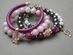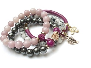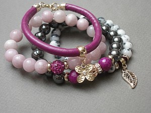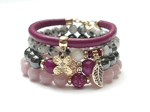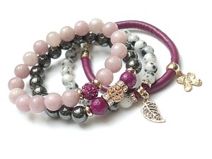 ******** PRAWA AUTORSKIE *********. WSZELKIE INNE PODOBNE MODELE TO KOPIE NARUSZAJĄCE PRAWA AUTORSKIE Nowa odsłona naszych setów - "ACCENT-POINT SET" - neutralne ,stonowane tło i akcent kolorystyczny jako tylko mały punkt . W tym przypadku akcentem jest kolor bordowy. Komplet czterech bransoletek wykonanych z naturalnych kamieni: hematyt [8mm], jadeity [8 mm], jadeity fasetowane [10mm], kryształków Swarovskiego bicone [4mm], przekładki shamballa wysadzanej kryształkami Swarovskiego, rzemienia ze skóry ekologicznej oraz elementów metalowych w kolorze tzw. różowego złota. Bransoletki pasują na nadgarstek 16 - 17cm. Biżuteria ozdobnie zapakowana