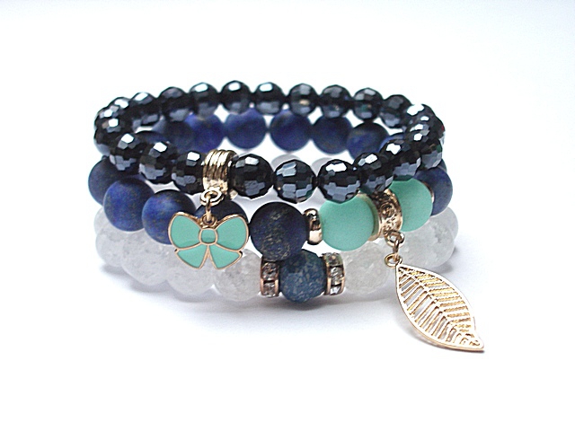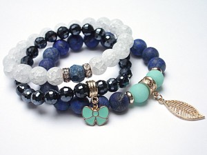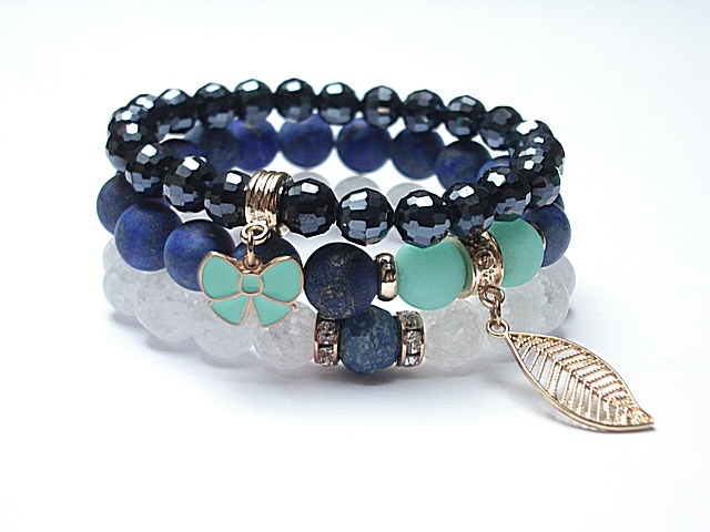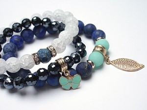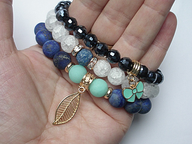 ******** PRAWA AUTORSKIE ********* Nowa odsłona naszych setów - "ACCENT-POINT SET" - neutralne ,stonowane tło i akcent kolorystyczny jako tylko mały punkt . W tym przypadku akcentem jest kolor miętowy. Komplet trzech bransoletek wykonanych z naturalnych kamieni: matowy lapis lazuli z pirytem [10mm] , jadeit matowy [10mm] , kwarc matowy [10mm], kryształków fasetowanych [8mm], przekładki z kryształkiem Swarovskiego oraz elementów metalowych w kolorze tzw. różowego złota. Bransoletki pasują na nadgarstek 16-17cm. Biżuteria ozdobnie zapakowana