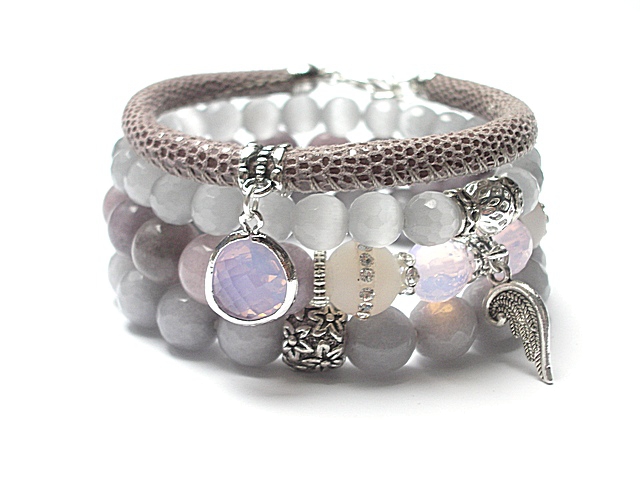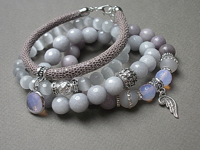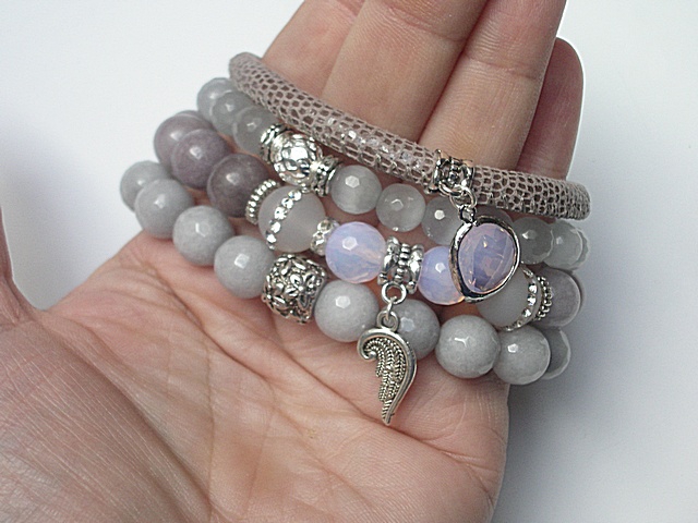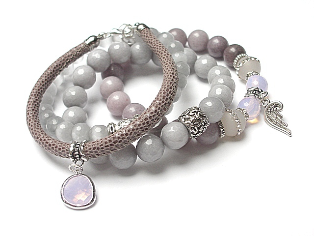 ******** PRAWA AUTORSKIE ********* Nowa odsłona naszych setów - "ACCENT-POINT SET" - neutralne, stonowane tło i akcent kolorystyczny jako tylko mały punkt. W tym przypadku akcentem jest kolor liliowy. Komplet czterech bransoletek wykonanych z naturalnych kamieni: jadeity [10mm], uleksyt fasetowany [8mm], opalit fasetowany o różowym wybarwieniu [10mm], agaty wysadzane cyrkoniami [10mm], rzemienia z naturalnej, miękkiej, cielęcej skóry o strukturze węża [śr. 5mm], efektownej przywieszki ze szkła w oprawie oraz elementów metalowych w kolorze srebrnym. Bransoletki pasują na nadgarstek 16-17cm. Biżuteria ozdobnie zapakowana