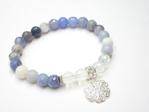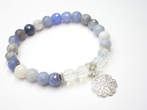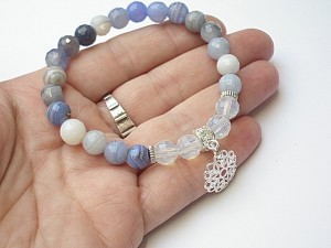 Bransoletka wykonana z kamieni naturalnych - fasetowane agaty [8mm] , kryształków [8mm] oraz elementów w kolorze srebra. Bransoletka na gumce silikonowej. Pasuje na nadgarstek 15,5-16,5cm. Biżuteria ozdobnie zapakowana. Możliwość dopasowania bransoletki do nadgarstka - wcześniej prosimy o kontakt.