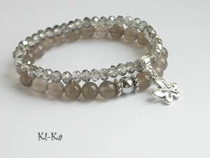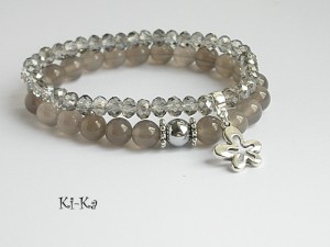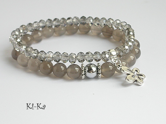 Komplet dwóch bransoletek wykonany z naturalnych minerałów - agaty [8mm], kryształki [6mm ] oraz elementów w kolorze srebra. Bransoletki na gumce silikonowej. Pasuje na nadgarstek 15-16cm. Biżuteria ozdobnie zapakowana.