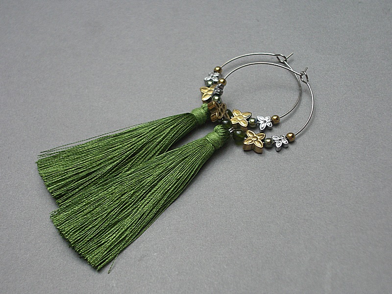 Kolczyki wykonane ze stali szlachetnej w połączeniu z satynowymi chwostami, kuleczkami marmurów [4mm], hematytami. Średnica kół [35mm]. Całkowita długość kolczyków 10,5cm. Biżuteria ozdobnie zapakowana.