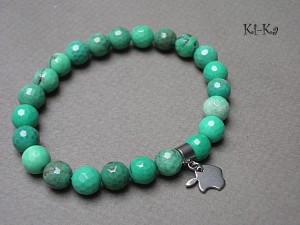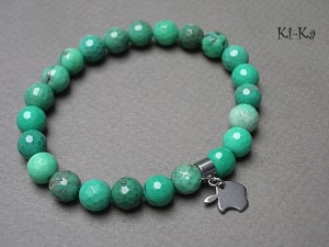 PROJEKT AUTORSKI . Kolekcja Alloys Collection to propozycje , które wykonywane są tylko z brązu ,brązu platerowanego srebrem [pr.925] lub stali szlachetnej - żadnych innych metali. Bransoletka wykonana z naturalnych minerałów - chryzopraz [cenna odmiana chalcedonu 8mm] oraz elementów ze stali szlachetnej. Bransoletka na gumce silikonowej. Pasuje na nadgarstek 16-17cm. Biżuteria ozdobnie zapakowana. Istnieje możliwość wykonania bransoletki w innym rozmiarze - wcześniej prosimy o kontakt.
