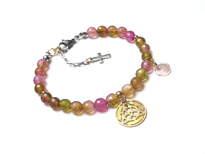 Bransoletka wykonana w całości ze stali szlachetnej i stali szlachetnej pozłacanej w połączeniu z fasetowanymi kuleczkami jadeitów [6mm]. Całkowita długość bransoletki 18cm plus przedłużka. Biżuteria ozdobnie zapakowana.