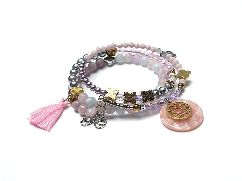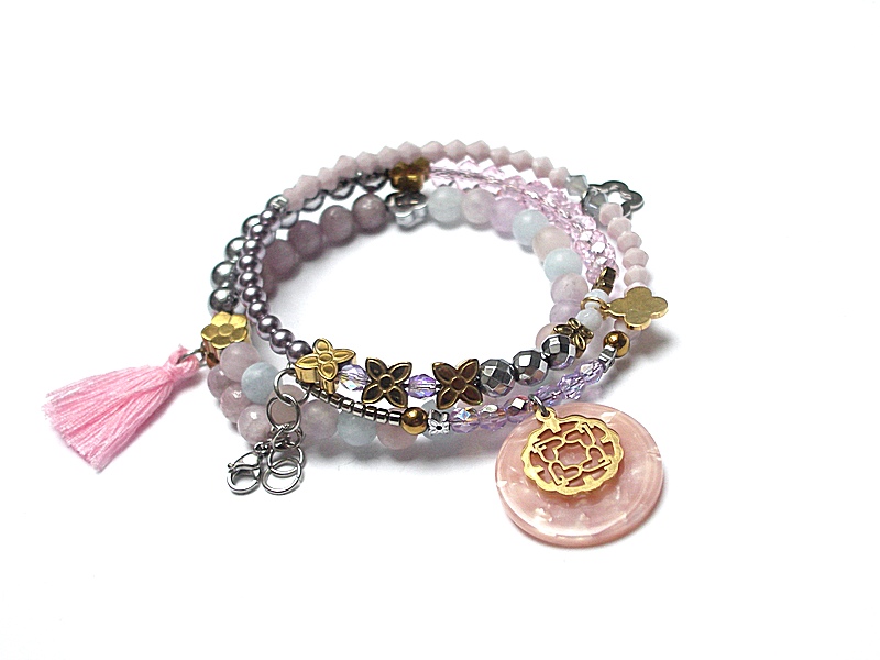 Bransoletka wykonana w całości ze stali szlachetnej i stali szlachetnej pokrytej złotem na drucie pamięciowym z kamieni naturalnych - kuleczek szlachetnego kunzytu [6mm], kuleczek matowych kwarców [6mm], hematytów [6mm, 4mm i 2mm], hematytowych kwiatków i motylków, kryształków [6mm i 4mm], zawieszką z żywicy oraz chwostem. Bransoletka owijana trzy razy wokół nadgarstka z zapięciem. Pasuje na nadgarstek 1,5-16,6cm. Biżuteria ozdobnie zapakowana.
