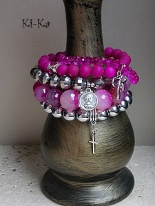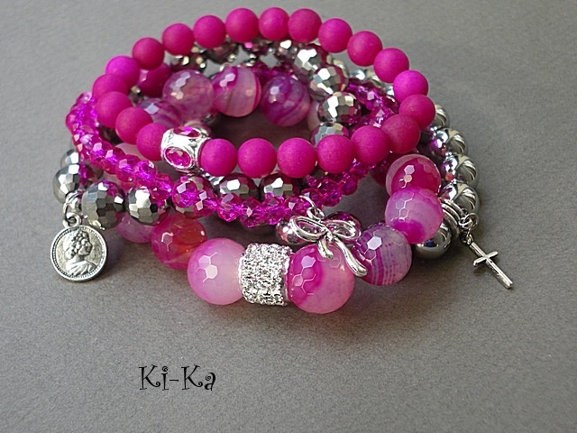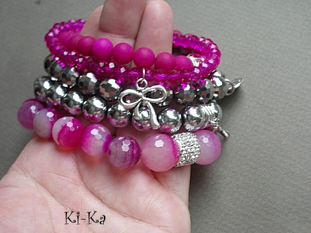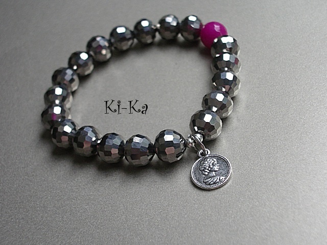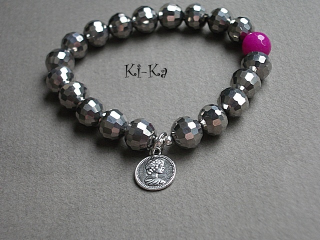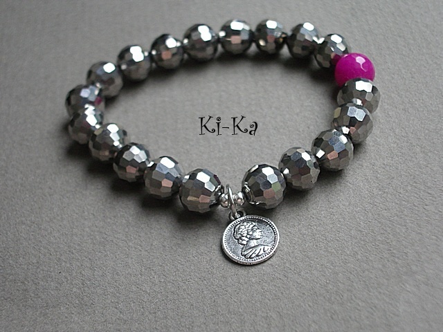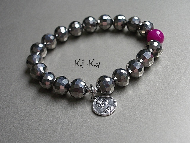 Bransoletka wykonana z fasetowanych szklanych kulek [10mm], kuleczki jadeitu w kolorze amarantu [10mm] oraz elementów w kolorze srebra. . Pasuje na nadgarstek 15 -16,5cm . Bransoletka na gumce silikonowej. Biżuteria ozdobnie zapakowana. Bransoletka może stanowić komplet z innymi bransoletkami dostępnymi w naszej galerii - przykładowe zdjęcia.