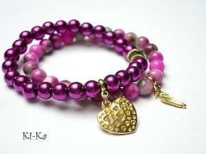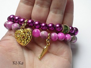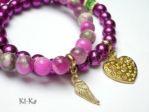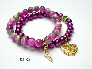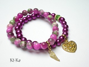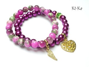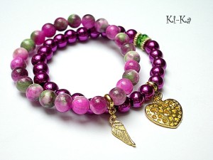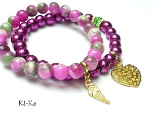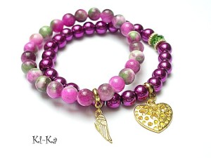 Komplet dwóch bransoletek wykonanych z naturalnych minerałów: marmur [8mm] ,hematyty [8mm] ,kryształka Swarovskiego [8mm fern green] oraz elementów w kolorze złotym Bransoletki z kamieni na gumce silikonowej. Bransoletki będą pasowały na nadgarstek 16-17cm.