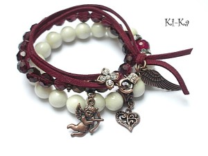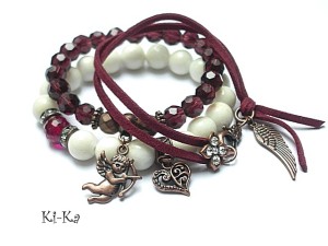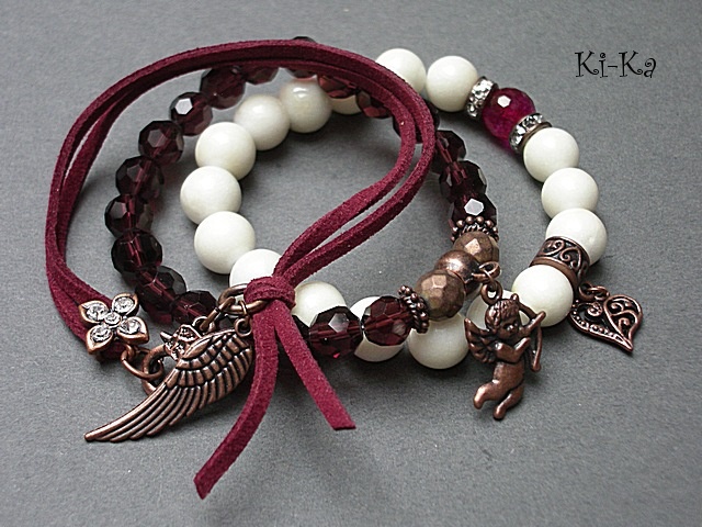 PROJEKT AUTORSKI Komplet trzech bransoletek wykonany z kamieni naturalnych - biała muszla [10mm] ,fasetowana kuleczka kwarcu [10mm] ,fasetowane kuleczki matowych hematytów [8mm] ,kryształki [8mm] ,rzemień ekologiczny oraz elementy w kolorze antycznej miedzi . Pasują na nadgarstek 15,5-16,5. Bransoletki na gumce silikonowej. Biżuteria ozdobnie zapakowana