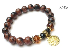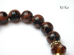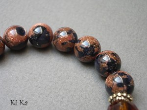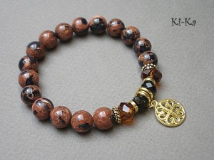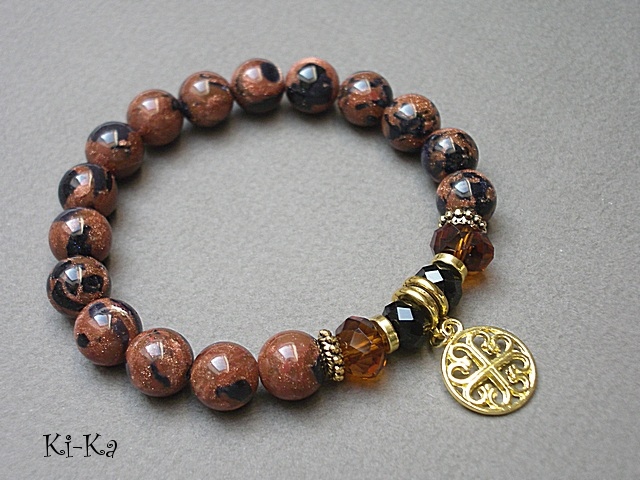 Bransoletka wykonana z kuleczek piasku pustyni z nocą kairu [10mm] ,kryształkami [10mm i 8mm] oraz elementów w kolorze złota. Bransoletka na gumce silikonowej. Pasuje na nadgarstek 16-17cm. Biżuteria ozdobnie zapakowana
