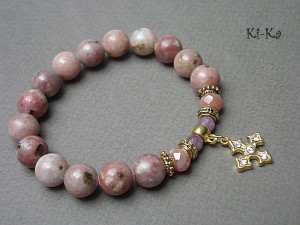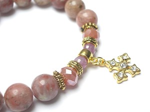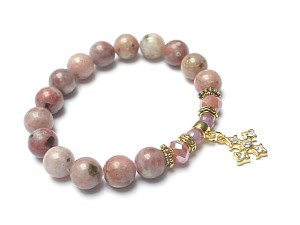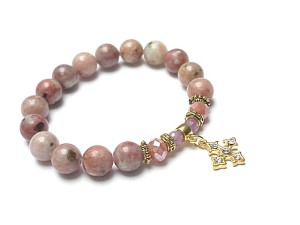 Bransoletka wykonana z naturalnych kamieni - rubiny fasetowane [5mm], jaspis [10mm], kryształków fasetowanych [6 x 8mm], przywieszki wysadzanej cyrkoniami oraz elementów metalowych w kolorze złota. Bransoletka pasuje na nadgarstek 16-17cm. Biżuteria ozdobnie zapakowana.