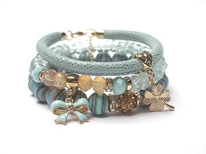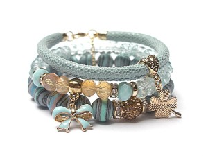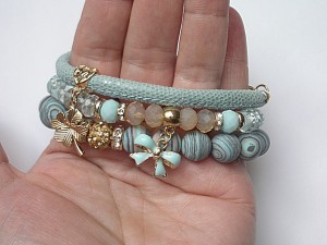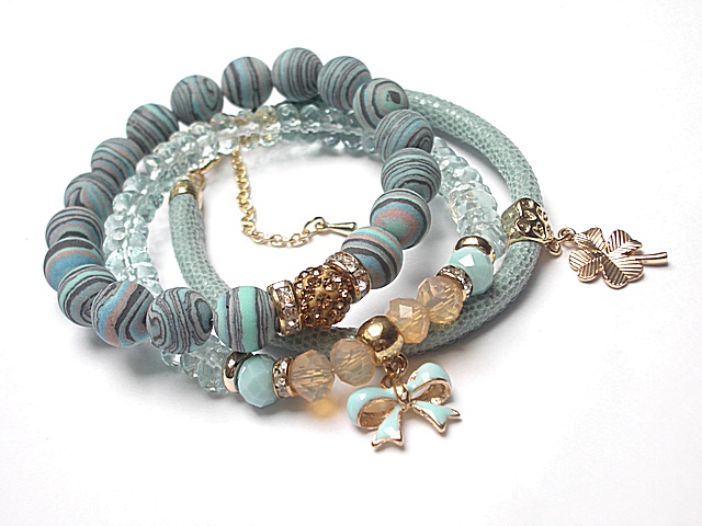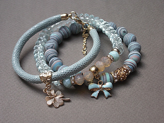 Komplet trzech bransoletek wykonany z kamieni naturalnych - fasetowane oponki kwarców aqua [klasa A 8mm] ,kuleczki prasowanych turkusów [10mm] ,kryształki [8mm] kuleczki shamballa wysadzanej kryształkami swarovskiego [10mm] rzemienia z naturalnej, miękkiej skóry cielęcej [śr. 5mm] oraz elementów metalowych w kolorze tzw. różowego złota. Pasują na nadgarstek 16-17cm. Bransoletki z kamieni gumce silikonowej. Biżuteria ozdobnie zapakowana.