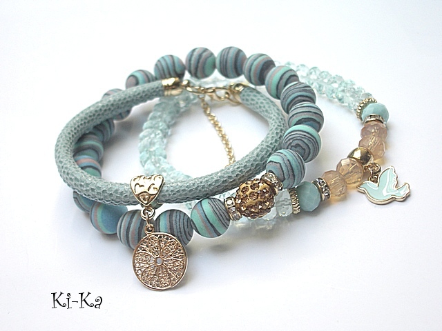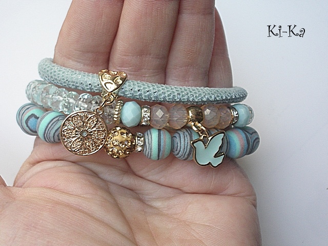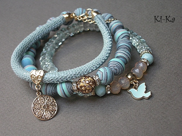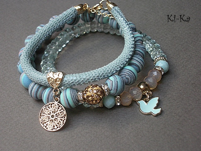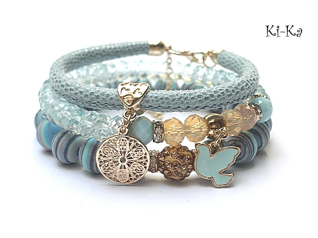 Komplet trzech bransoletek wykonany z kamieni naturalnych - fasetowane oponki kwarców aqua [klasa AAA; 8mm] ,kuleczki prasowanych turkusów [10mm], kryształki fasetowane [6 x 8mm], kuleczki shamballa wysadzanej kryształkami Swarovskiego [10mm], rzemienia z naturalnej, miękkiej skóry cielęcej [śr. 5mm] oraz elementów metalowych w kolorze tzw. różowego złota. Pasują na nadgarstek 16-17cm. Bransoletki z kamieni gumce silikonowej. Biżuteria ozdobnie zapakowana