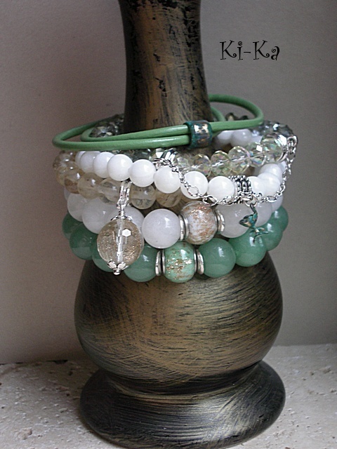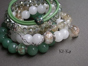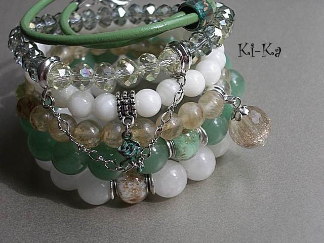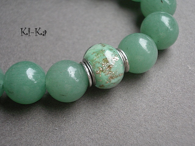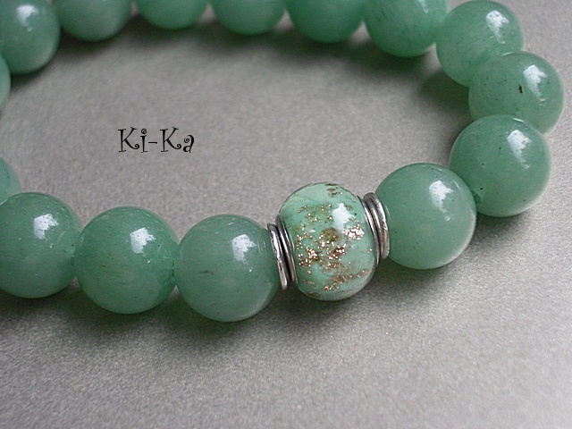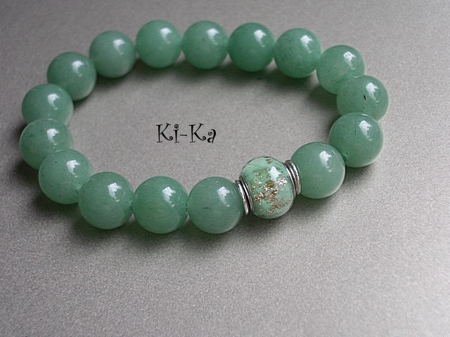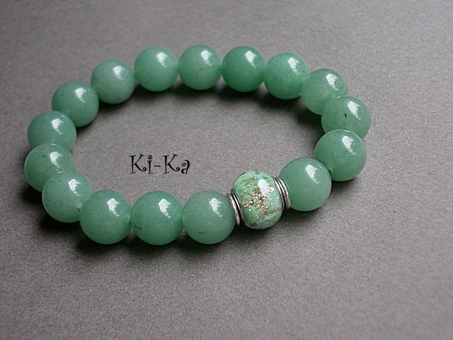 Bransoletka wykonana z naturalnych minerałów [awenturyn 14mm] oraz przekładki w kolorze srebrnym. Bransoletka na gumce silikonowej. Pasuje na nadgarstek 16-17,5cm. Biżuteria ozdobnie zapakowana. Bransoletka może stanowić komplet z innymi bransoletkami - przykładowe zdjęcia.