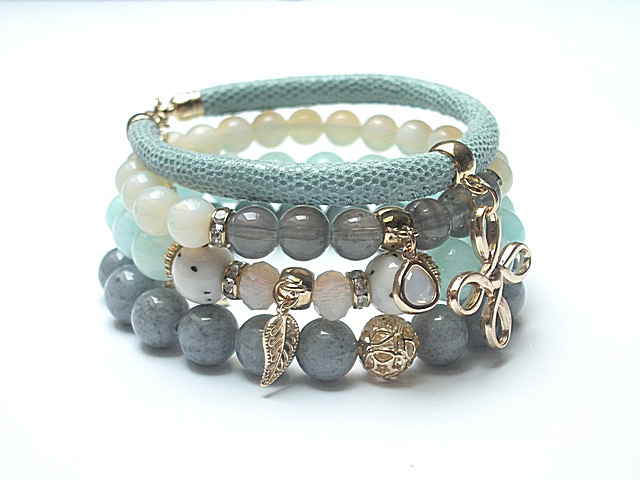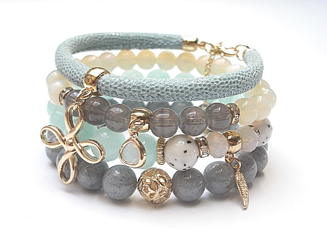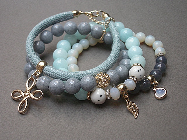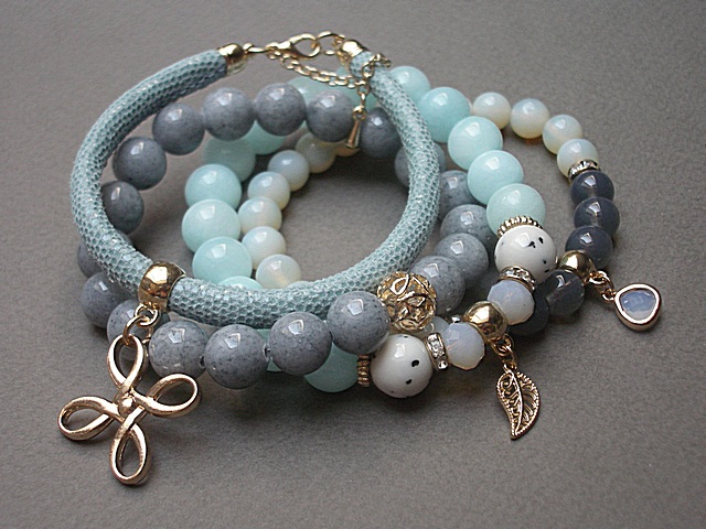 PROJEKT AUTORSKI. WŁASNOŚĆ KI-KA. KOPIOWANIE ZABRONIONE. Komplet czterech bransoletek wykonanych z naturalnych kamieni: jadeity [10mm], marmur [10mm], opality [8mm] ,szklane kuleczki [8mm] skórzanego rzemienia z naturalnej skórki koziej [śr. 5mm], kryształków fasetowanych [6 x 8mm], zawieszki w okuciu oraz elementów metalowych w kolorze różowego złota. Bransoletki pasują na nadgarstek 16-17cm. Biżuteria ozdobnie zapakowana. Możliwość dopasowania bransoletek do innego nadgarstka - wcześniej prosimy o kontakt.