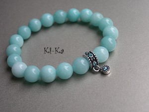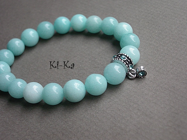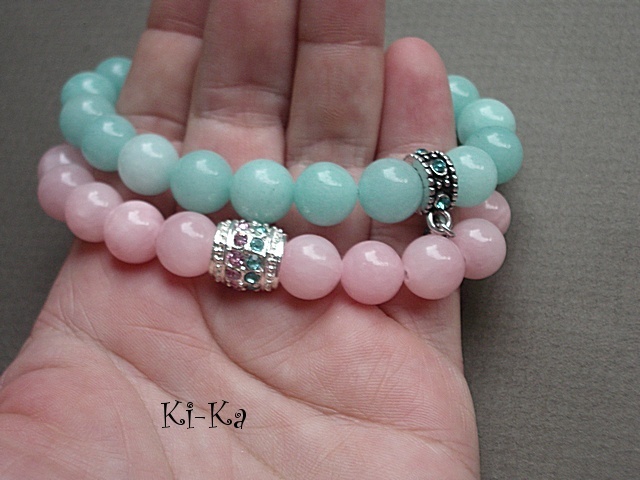 Bransoletka wykonana z naturalnych minerałów - jadeity [10mm] oraz elementów w kolorze srebrnym wysadzanych kryształkami .Bransoletka na gumce silikonowej .Pasuje na nadgarstek 15,5-16,5cm.Bransoletka może stanowić komplet z innymi dostępnymi w naszej galerii - przykładowe zdjęcia. Biżuteria ozdobnie zapakowana.