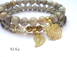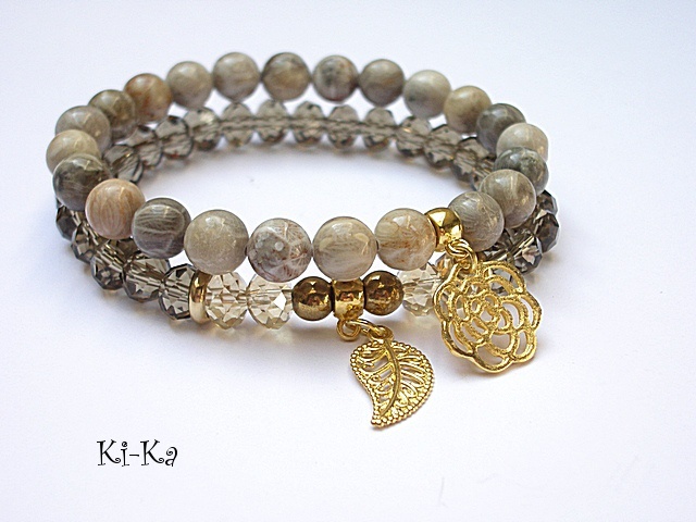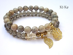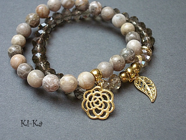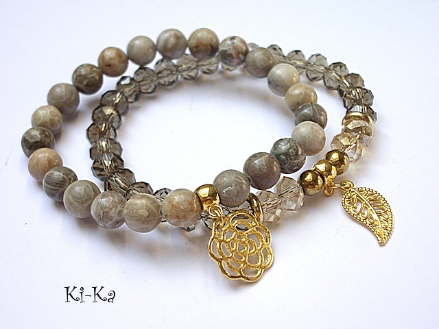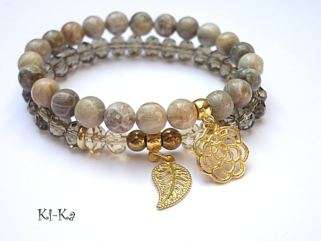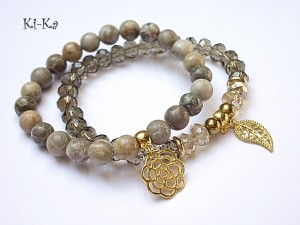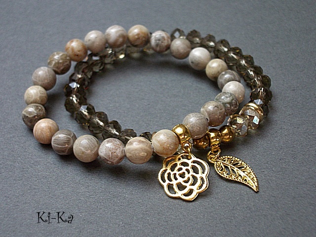 Komplet dwóch bransoletek wykonanych z naturalnych kamieni [8mm], kryształków [8 x 10mm], hematytu [6mm] oraz elementów metalowych w kolorze złota. Bransoletki na gumce silikonowej. Pasują na nadgarstek 15,5 - 16,5cm. Biżuteria ozdobnie zapakowana. Możliwość dopasowania bransoletek do nadgarstka - wcześniej prosimy o kontakt