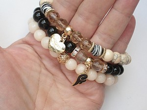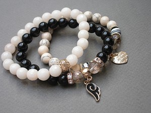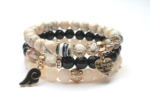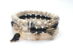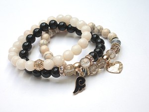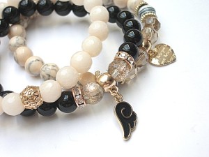 PROJEKT AUTORSKI. Własność KI-Ka. KOPIOWANIE ZABRONIONE. Komplet trzech bransoletek wykonany z kamieni naturalnych - jadeity fasetowane [8mm], onyks [8mm], howlit [8mm], kwarc z drobinkami złota [8mm], turkus rekonstruowany [8mm], kryształki fasetowane [8mm] oraz elementów metalowych w kolorze tzw. różowego złota. Pasują na nadgarstek 16-17cm. Bransoletki z kamieni i szkła na gumce silikonowej. Biżuteria ozdobnie zapakowana