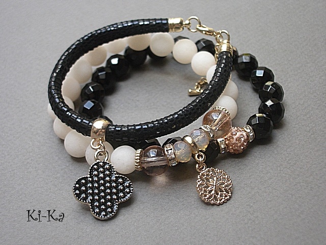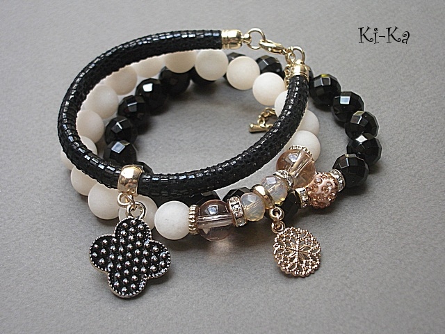 PROJEKTY AUTORSKIE. WŁASNOŚĆ KI-KA. KOPIOWANIE ZABRONIONE. Komplet trzech bransoletek wykonany z naturalnych kamieni - agat matowy [10 mm], onyks fasetowany [10mm], kryształków fasetowanych [6 x 8mm], szklanych kuleczek [10mm], przekładki shamballa wysadzanej kryształkami Swarovskiego, rzemienia z naturalnej, cielęcej skórki [śr. 6mm] oraz elementów metalowych w kolorze tzw. różowego złota. Bransoletki z kamieni na gumce silikonowej. Pasują na nadgarstek 16-17cm. Biżuteria ozdobnie zapakowana