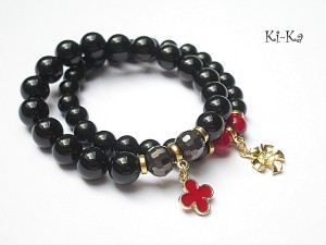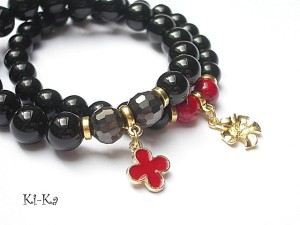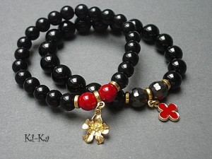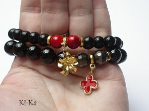 Komplet dwóch bransoletek wykonanych z naturalnych kamieni: onyksu [10mm], szkła [8mm], kryształków [10mm], howlitu [8mm] oraz elementów metalowych w kolorze jasnego złota. Bransoletki na gumce silikonowej. Pasują na nadgarstek 15,5-16,5cm. Biżuteria ozdobnie zapakowana. Możliwość dopasowania bransoletek do nadgarstka - wcześniej prosimy o kontakt.