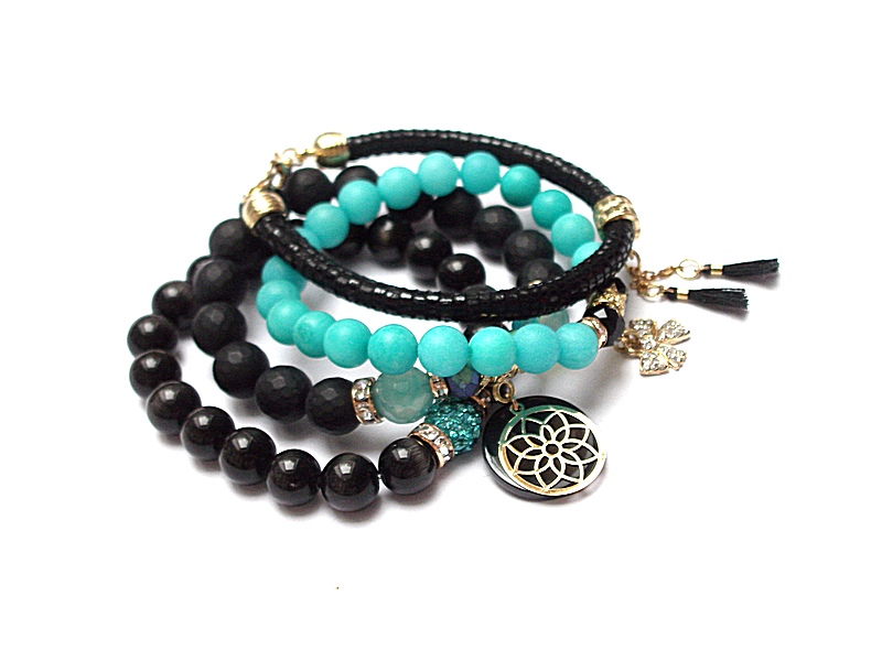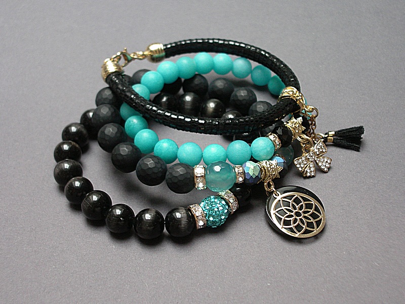 Komplet czterech bransoletek wykonanych z naturalnych kamieni: jadeity [8mm], black stone matowy fasetowany [10mm], kocie oko [10mm], agaty fasetowane [10mm], kryształków fasetowanych [6x8mm], rzemienia z naturalnej skórki, zawieszki wysadzanej cyrkoniami, przekładki shamballa wysadzanej kryształkami, zawieszki z żywicy, chwostów oraz elementów metalowych w kolorze złota. Bransoletki pasują na nadgarstek 16 - 17cm. Biżuteria ozdobnie zapakowana