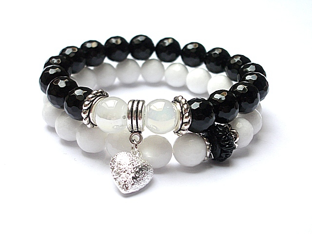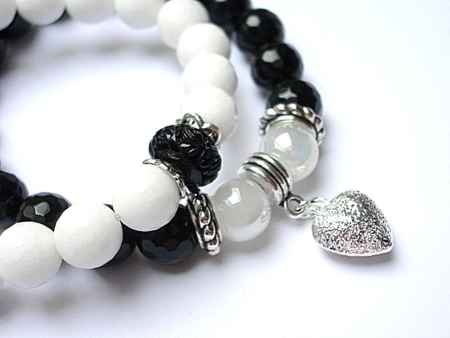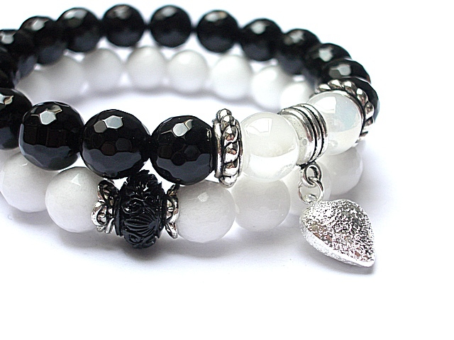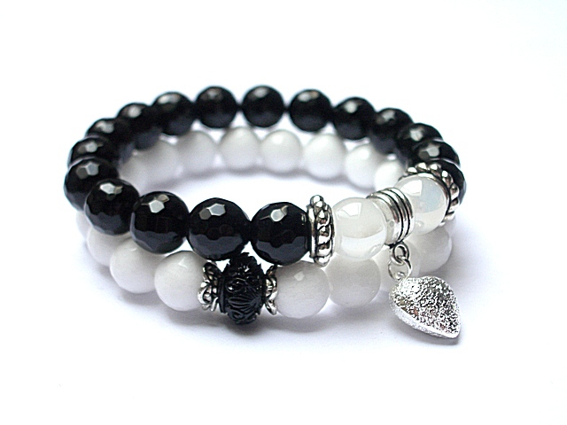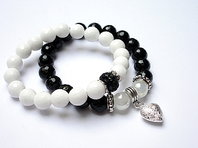 Komplet dwóch bransoletek wykonanych z naturalnych kamieni - jadeity fasetowane [10mm], onyks fasetowany [10mm], szkło opalizujące [10mm], przekładki z naturalnego, rzeźbionego korala oraz elementów w kolorze srebra. Bransoletki na gumce silikonowej. Pasują na nadgarstek 16-17cm. Biżuteria ozdobnie zapakowana.