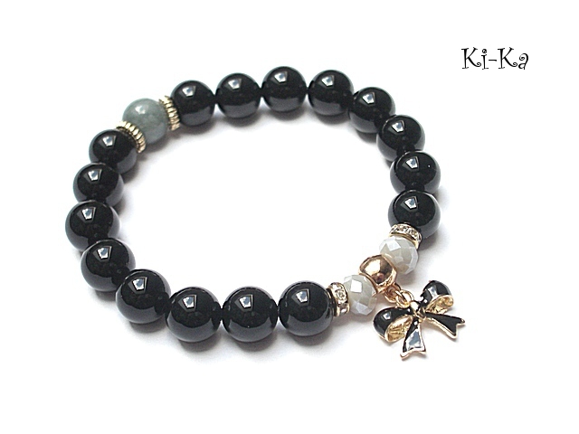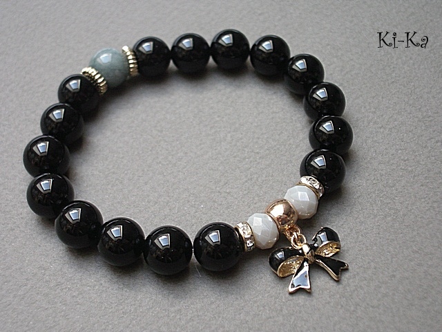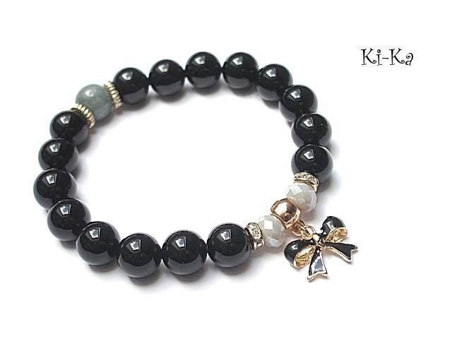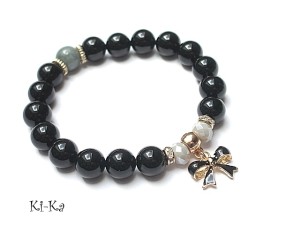 Bransoletka wykonana z kuleczek gładkich onyksów [10mm] ,kuleczki jadeitu [10mm] ,kryształków [8mm] oraz elementów metalowych w kolorze różowego złota.Bransoletka pasuje na nadgarstek 16-17cm. Biżuteria ozdobnie zapakowana.
