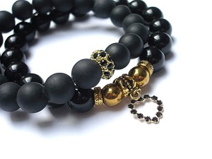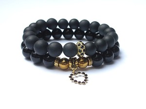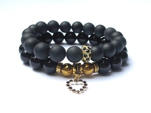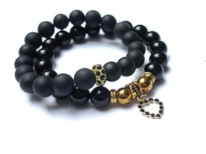 PROJEKTY AUTORSKIE. Komplet dwóch bransoletek wykonanych z naturalnych minerałów -onyksy [10mm], matowe kuleczki blackstone [10mm] ,hematyty [8mm] ,zawieszki -serca z metalu pokrytego srebrem [pr.925] pozłoconego 18k złotem i wysadzanego kryształkami Swarovskiego oraz elementów metalowych w kolorze złota. Bransoletki na gumce silikonowej. Pasują na nadgarstek 16-17cm. Biżuteria ozdobnie zapakowana