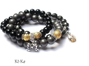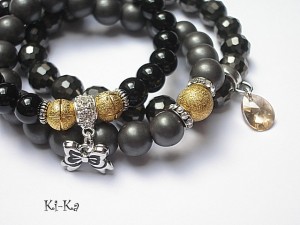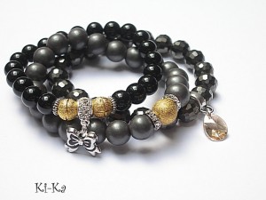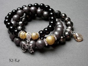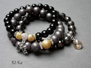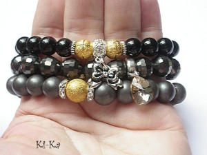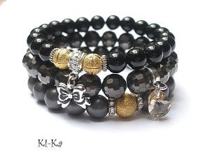 PROJEKT AUTORSKI. Komplet trzech bransoletek wykonanych z naturalnych minerałów: onyks [10mm], hematyt matowy [10mm], kryształków fasetowanych [10mm], przywieszki z kryształkiem Swarovskiego oraz elementów metalowych w kolorze srebra. Bransoletki pasują na nadgarstek 15,5 - 16,5cm. Biżuteria ozdobnie zapakowana.