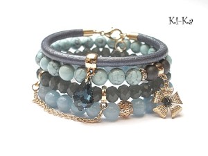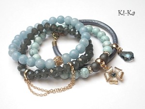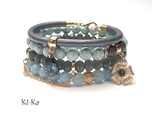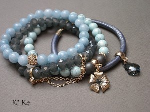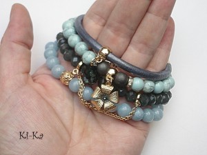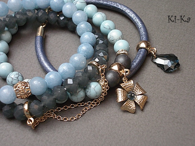 PROJEKT AUTORSKI. Własność Ki-Ka. KOPIOWANIE ZABRONIONE . Komplet czterech bransoletek wykonanych z naturalnych kamieni - jadeity [8mm], hematyt matowy [8mm],howlit [8mm], rzemienia z naturalnej, metalicznej, skóry , kryształków fasetowanych [8 x 6mm], kryształka Swarovskiego w kształcie kropli barokowej, zawieszki w formie kwiatka z kryształkiem Swarovskiego oraz elementów metalowych w kolorze złotym. Pasują na nadgarstek 16-17cm . Biżuteria ozdobnie zapakowana.