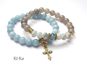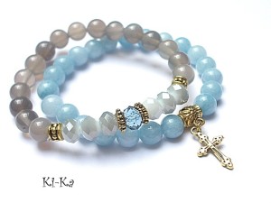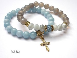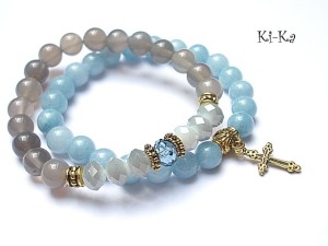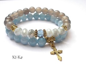 Komplet dwóch bransoletek wykonanych z naturalnych minerałów: agaty transparentne [8mm], jadeity [8mm], kryształków [8 x 6mm] oraz elementów w kolorze złota. Bransoletki na gumce silikonowej. Bransoletki będą pasowały na nadgarstek 15,5-16,5cm.