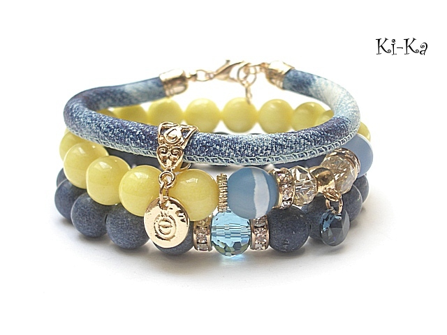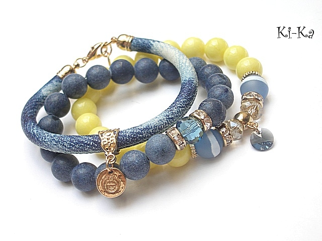 Komplet trzech bransoletek wykonanych z naturalnych kamieni - jadeity [10mm], matowe jadeity [10mm], agaty [10mm], kryształki [10mm i 8mm], zawieszki z kryształkiem Swarovskiego [rivoli, 8mm], rzemienia z naturalnej skóry imitującej jeans oraz elementów metalowych w kolorze tzw. różowego złota. Bransoletki pasują na nadgarstek 16-17cm. Biżuteria ozdobnie zapakowana.