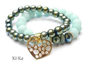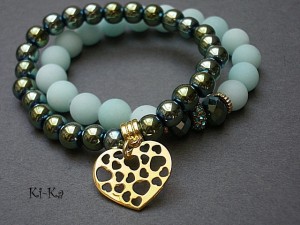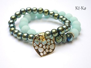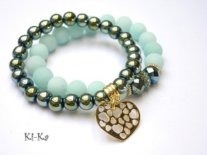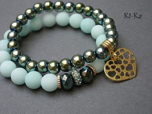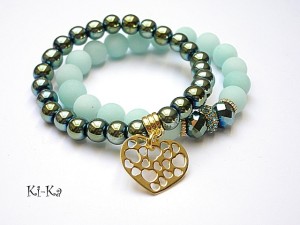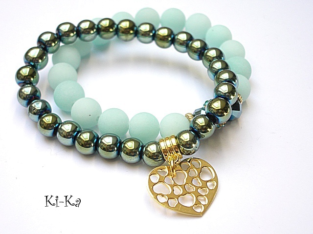 Komplet dwóch bransoletek wykonanych z naturalnych kamienia: hematyt [8mm], jadeit matowy [10mm], kryształków [8 x 10mm], przekładki wysadzanej kryształkami oraz elementów metalowych w kolorze złota. Bransoletki na gumce silikonowej. Pasują na nadgarstek 15 - 16,5cm. Biżuteria ozdobnie zapakowana. Możliwość dopasowania bransoletek do nadgarstka - wcześniej prosimy o kontakt