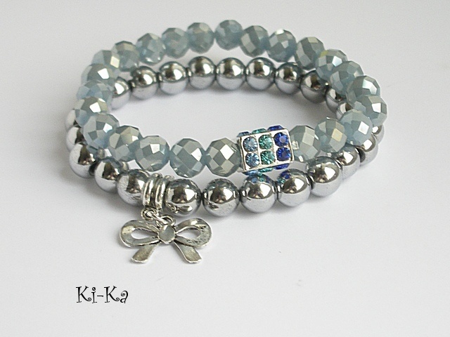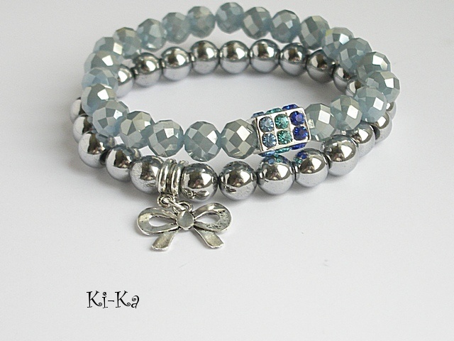 Komplet dwóch bransoletek wykonany z naturalnych minerałów - hematyty [8mm], kryształki [8mm ] oraz elementów w kolorze srebra. Bransoletki na gumce silikonowej. Pasuje na nadgarstek 15-16cm. Biżuteria ozdobnie zapakowana.
