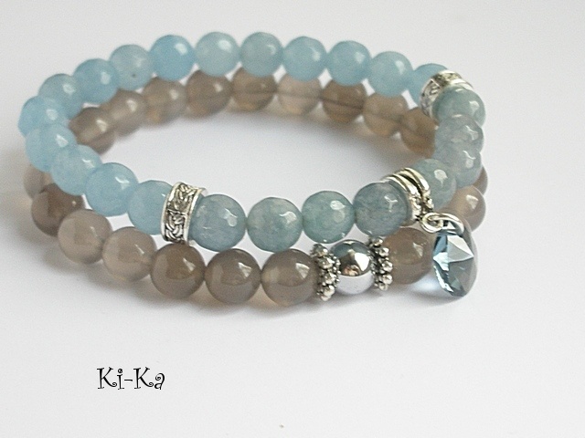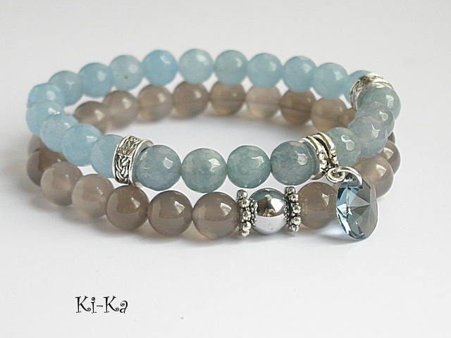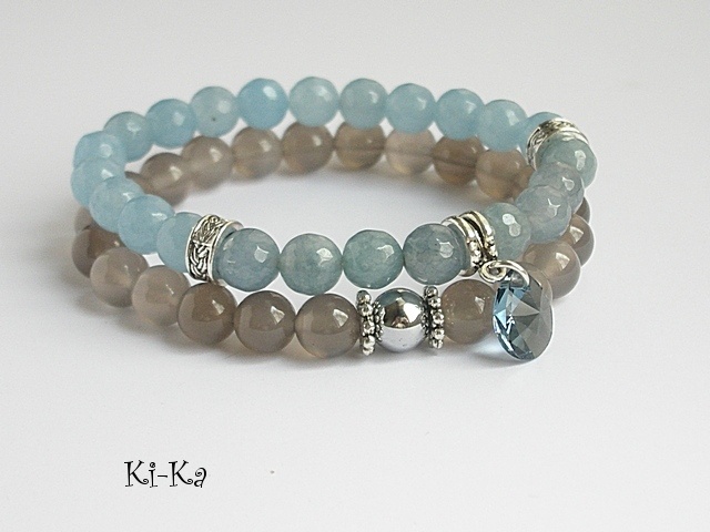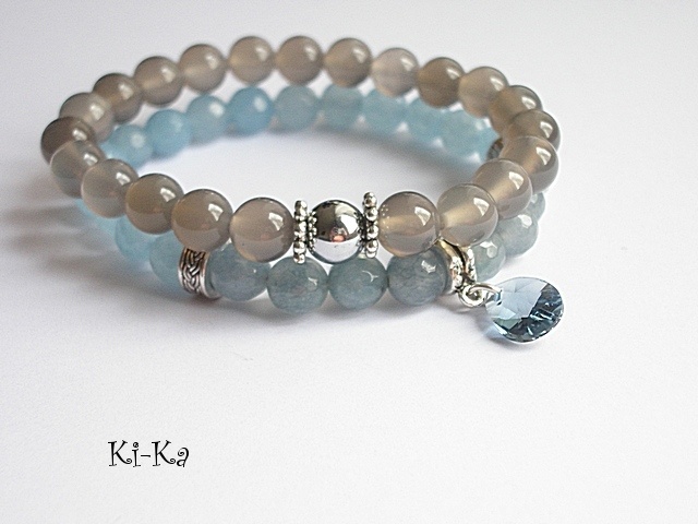 Komplet dwóch bransoletek wykonany z naturalnych minerałów - szare agaty [8mm], fasetowane kuleczki jadeitów [8mm] ,kryształek Swarovskiego [12mm denim blue] oraz elementów w kolorze srebra. Bransoletki na gumce silikonowej. Pasuje na nadgarstek 15-16cm. Biżuteria ozdobnie zapakowana.