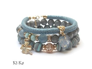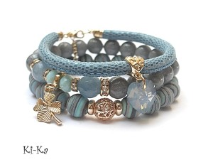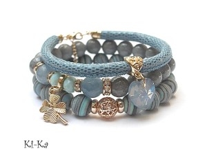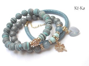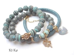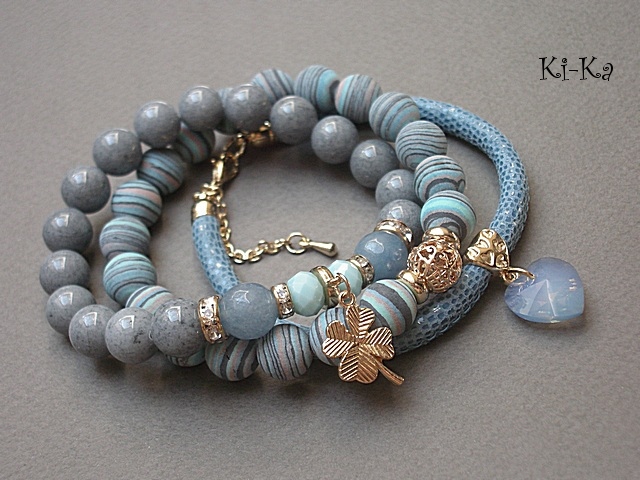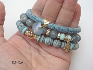 PROJEKT AUTORSKI. WŁASNOŚĆ KI-KA. KOPIOWANIE ZABRONIONE. Komplet trzech bransoletek wykonanych z naturalnych kamieni: marmur [10mm], jadeity fasetowane [10mm], turkus prasowany rekonstruowany [10mm], kryształków fasetowanych [6 x 8mm], przywieszki z kryształkiem Swarovskiego, skórzanego rzemienia ze skórki koziej o wężowym wzorze [6mm], oraz elementów metalowych w kolorze różowego złota. Bransoletki pasują na nadgarstek 16-17cm. Biżuteria ozdobnie zapakowana.