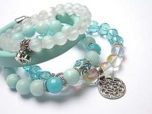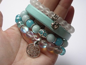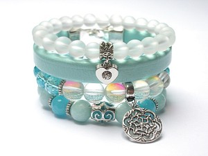 PROJEKT AUTORSKI Komplet czterech bransoletek wykonany z naturalnych minerałów - jadeity [10mm], kwarc mystic z efektem AB[10mm] ,kryształków [10mm], szkla matowego [8mm], rzemienia z naturalnej skóry oraz elementów w srebrnym kolorze.Bransoletki z kamieni i szkła na gumce silikonowej .Pasują na nadgarstek 15 -16,5 Biżuteria ozdobnie zapakowana