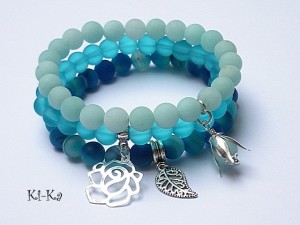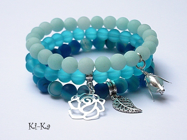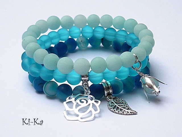 Komplet trzech bransoletek wykonanych z naturalnych kamieni [agaty 8mm; jadeity 8mm] kryształków [8mm] oraz elementów metalowych w srebrnym kolorze. Bransoletki pasują na nadgarstek 15 - 16,5cm. Biżuteria ozdobnie zapakowana.