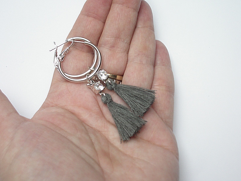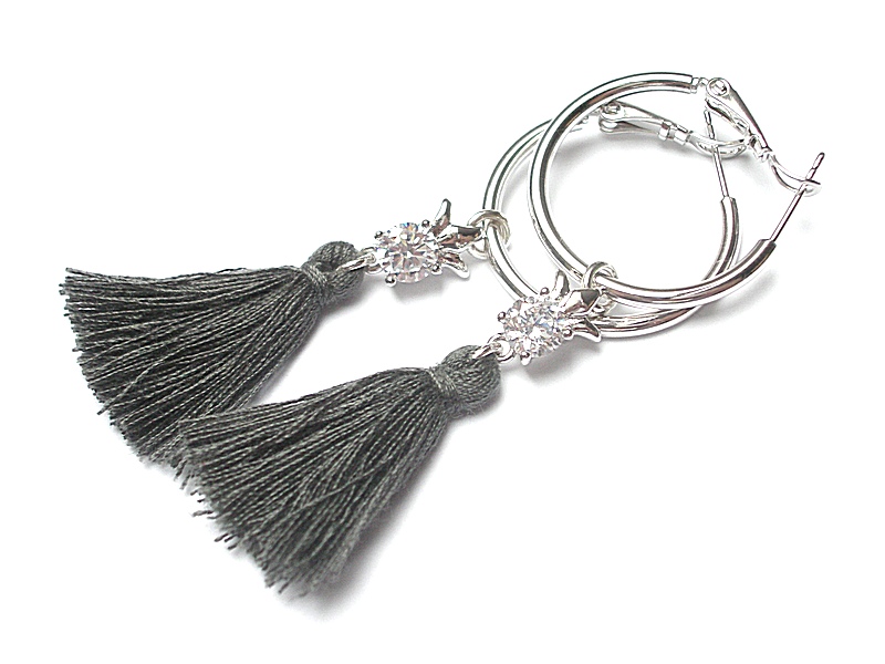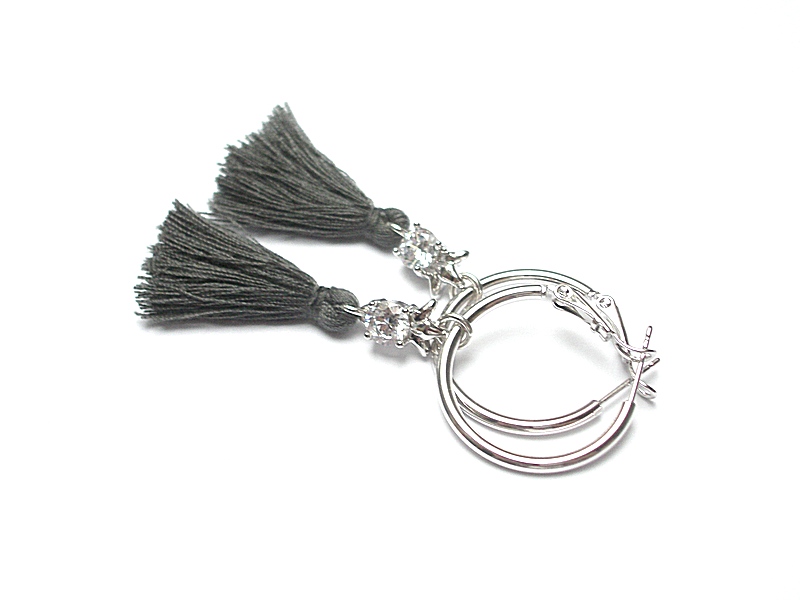 Kolczyki - koła [śr. 25mm] w połączeniu z łącznikami z cyrkoniami wykonane ze stopu miedzi pokrytego rodem i zabezpieczone lakierem jubilerskim, kółeczkami ze srebra [pr. 925/ oraz chwostami. Długość kolczyków 6,5cm. Biżuteria ozdobnie zapakowana