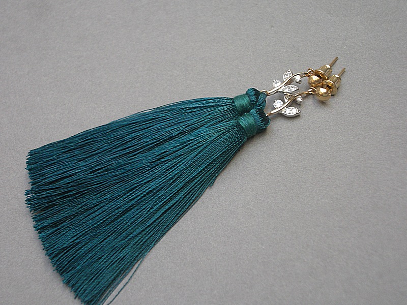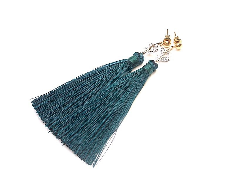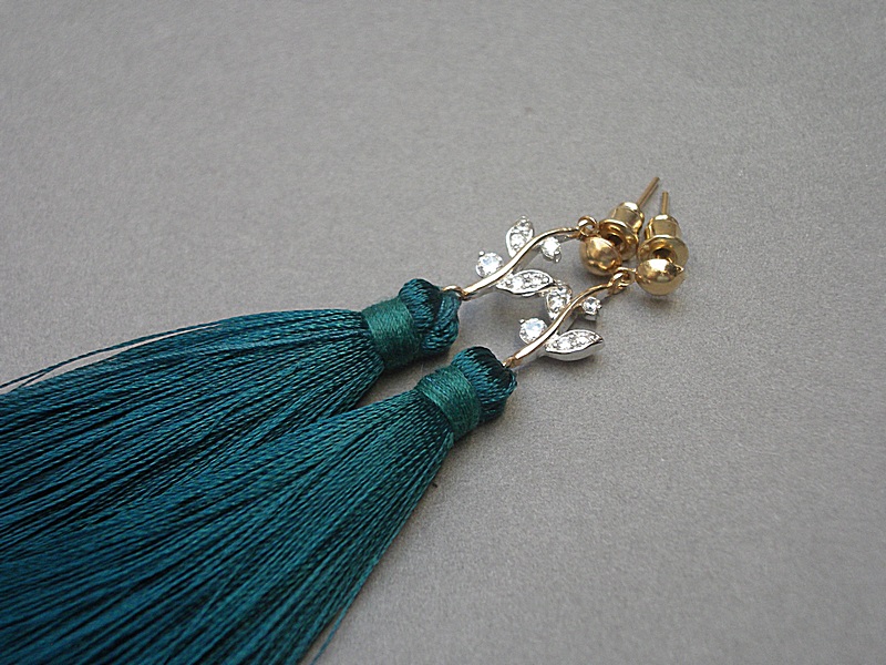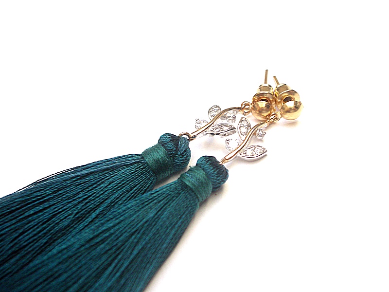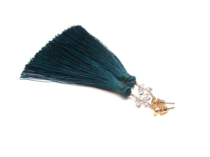Kolczyki wykonane z długich satynowych chwostów, łączników z cyrkoniami oraz elementów metalowych w kolorze złotym. Długość kolczyków 8,8cm. Biżuteria ozdobnie zapakowana.