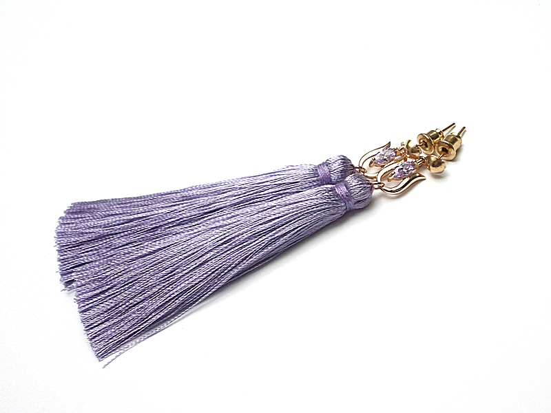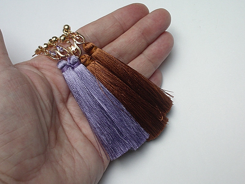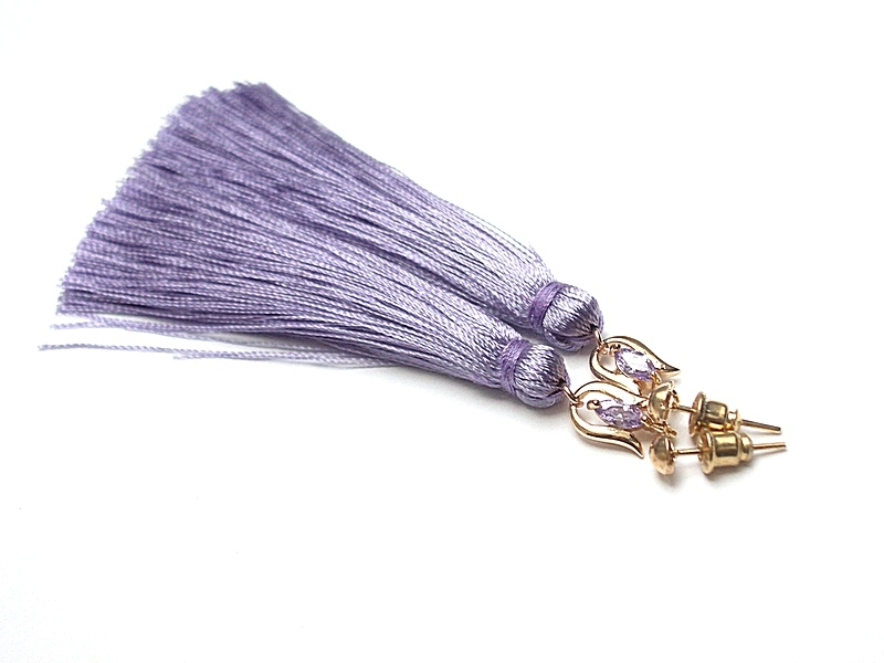Kolczyki wykonane z długich satynowych chwostów, łączników z cyrkoniami