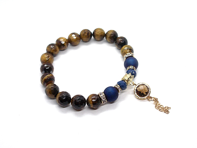 Bransoletka wykonana z naturalnych kamieni - fasetowane sokole oko [10mm], matowe sokole oko [10mm], kryształków [8mm], zawieszki w okuciu oraz elementów metalowych w kolorze złota. Bransoletka pasuje na nadgarstek 16-17cm. Biżuteria ozdobnie zapakowana.