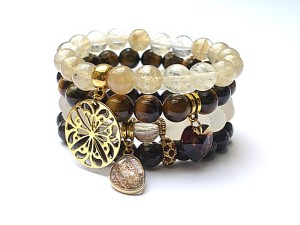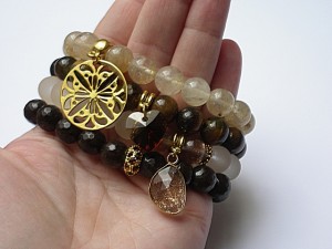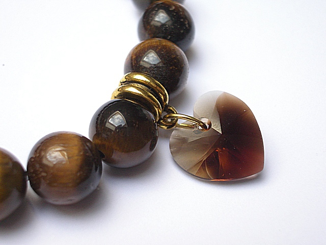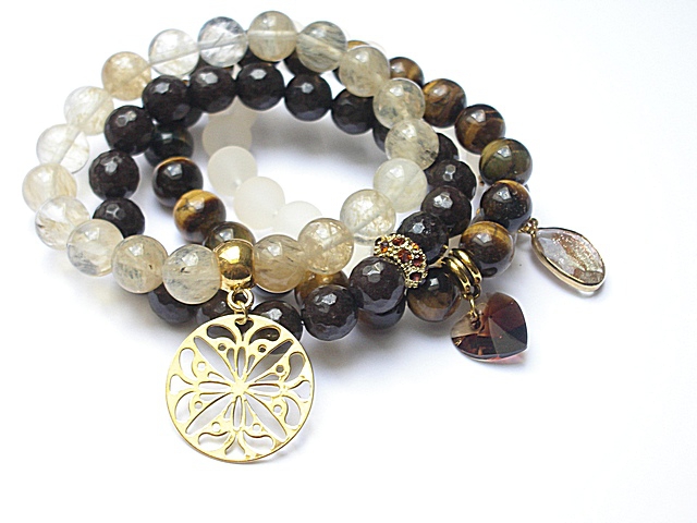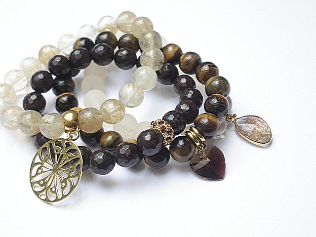 PROJEKT AUTORSKI. WSZELKIE INNE PODOBNE MODELE TO KOPIE NARUSZAJĄCE PRAWA AUTORSKIE .Komplet czterech bransoletek wykonanych z naturalnych kamieni - jadeity fasetowane [10mm], kwarc kawowy [10mm], kwarc z drobinkami złota [10mm], tygrysie oko [10mm], szkło matowe [10mm], przywieszki z kryształkiem Swarovskiego [serduszko], efektownej przywieszki ze szkła oraz elementów metalowych w kolorze złotym. Pasują na nadgarstek 15,5-16,5cm . Biżuteria ozdobnie zapakowana.