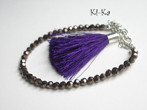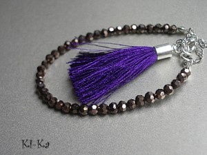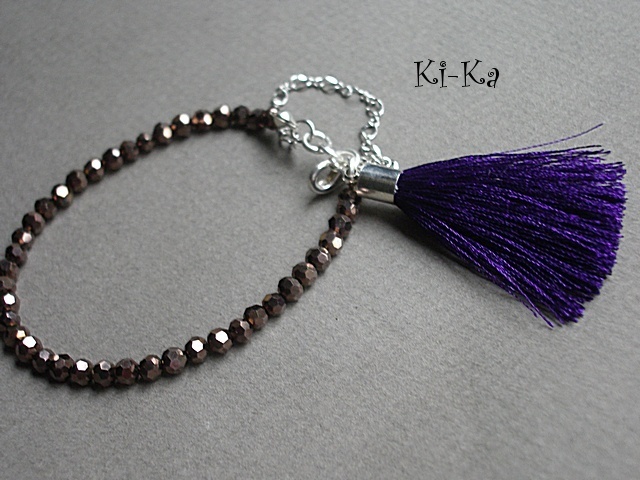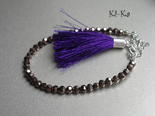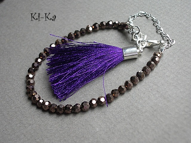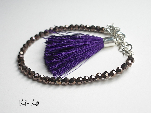 Bransoletka wykonana z drobnych kryrształków [szkło bardzo dobrej jakości], satynowego chwostu oraz elementów w kolorze srebrnym Pasuje na nadgarstek 15-16,5cm. Biżuteria ozdobnie zapakowana. Bransoletka może stanowić komplet z innymi bransoletkami - przykładowe zdjęcia. Zdjęcie pierwsze przedstawia przykładowy set. Cena dotyczy bransoletki z brązowych kryształków z chwostem.