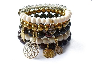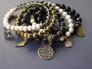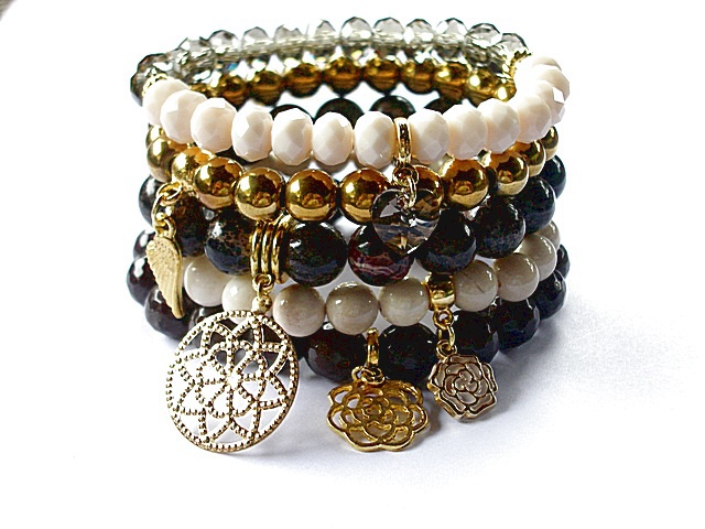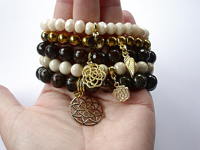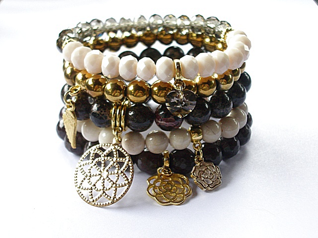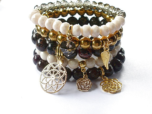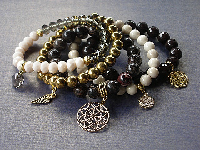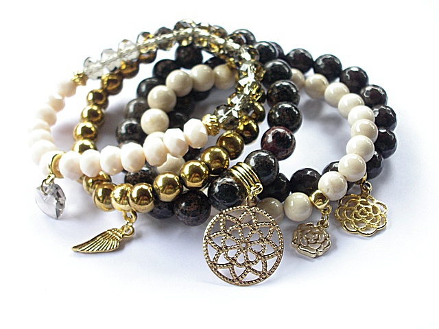 PROJEKT AUTORSKI. WSZELKIE INNE PODOBNE MODELE TO KOPIE NARUSZAJĄCE PRAWA AUTORSKIE.Kontynuacja modelu ,który powstał w naszej pracowni pół roku temu. Komplet pięciu bransoletek wykonanych z naturalnych kamieni: hematyt [8mm], marmur [8mm], jaspis cesarski [10mm] ,jadeity [10mm] krysztalków [6 x 8mm], kryształka Swarovskiego [serce 10mm ]oraz elementów metalowych w kolorze złota. Bransoletki pasują na nadgarstek 15,5 - 16,5cm. Biżuteria ozdobnie zapakowana.Możliwość dopasowania do innego rozmiaru nadgarstka.