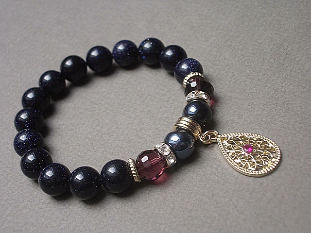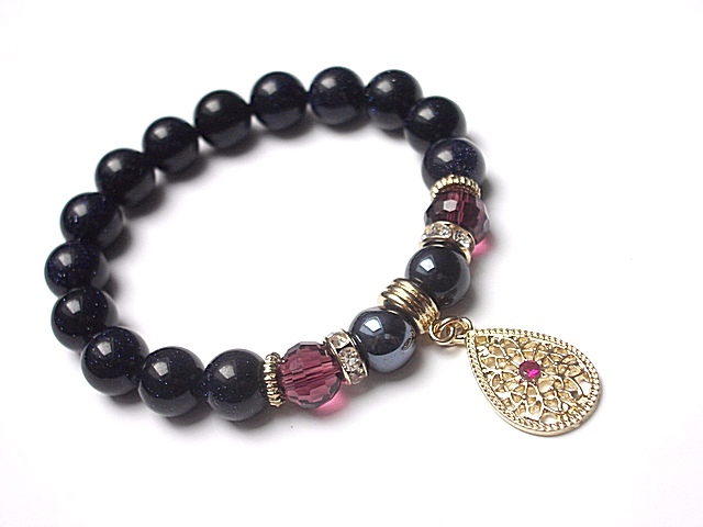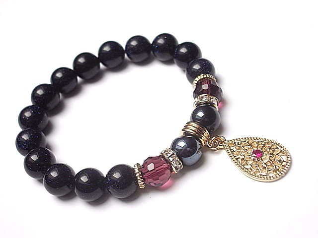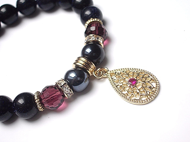 PROJEKT AUTORSKI. WŁASNOŚĆ KI-KA. KOPIOWANIE ZABRONIONE. Bransoletka wykonana z kuleczek nocy kairu [10mm], kryształków [10mm], szklanych opalizujacych kuleczek w kolorze granatowym [10mm], zawieszki z cyrkonią rubinową oraz elementów metalowych w kolorze złota. Pasują na nadgarstek 16-17cm. Biżuteria ozdobnie zapakowana