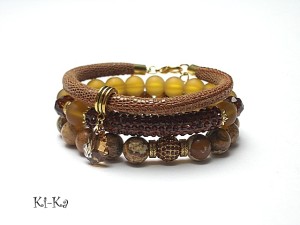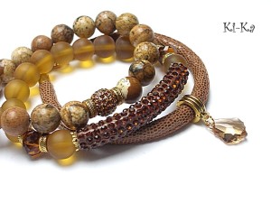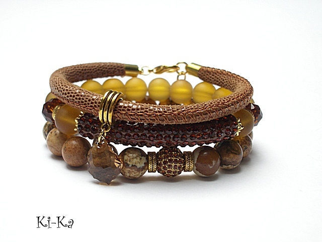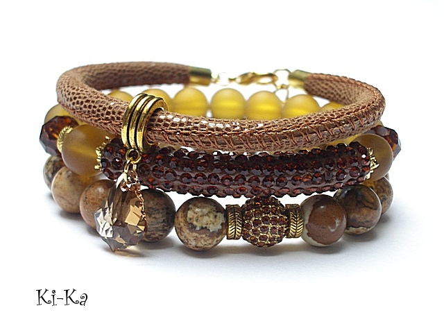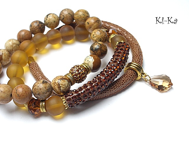 PROJEKT AUTORSKI. WŁASNOŚĆ KI-KA. KOPIOWANIE ZABRONIONE. Komplet trzech bransoletek wykonanych z naturalnych kamieni - jaspis krajobrazowy [10mm] , matowe szkło [10mm], rzemienia z naturalnej, miękkiej skóry cielęcej, ekskluzywnej przekładki wysadzanej cyrkoniami, tuby wysadzanej kryształkami, przywieszki z kryształkiem Swarovskiego, kryształków fasetowanych [8 x 10mm] oraz elementów metalowych w kolorze złota. Bransoletki pasują na nadgarstek 16-17cm. Biżuteria ozdobnie zapakowana